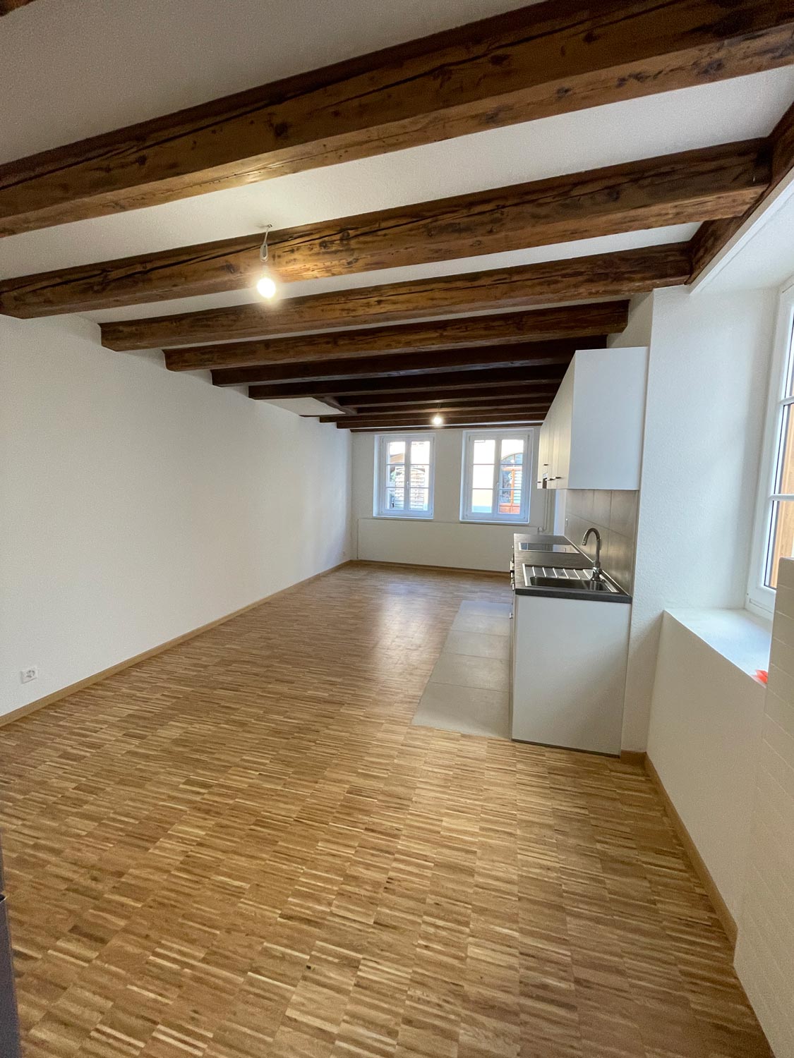 Un appartement modernisé, fonctionnel, baigné de lumière, tout en conservant le charme de l’ancien grâce à ses poutres apparentes mises en valeur.